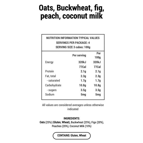 (Oats, Apple & Chia Porridge): Oats (50%) (Gluten), Apples (41%), Coconut Milk (4.5%), Chia Seeds (4%), Ground Cinnamon (0.5%) (Banana, Dragonfruit & Chia): Banana (60%), Dragonfruit (30%), Chia seeds (5%), Coconut Cream (4%), Hemp Seeds* (1%) (Oats, Fig & Peach): Oats (25%) (Gluten), Buckwheat (25%), Figs (20%), Peaches (20%), Coconut Milk (10%) (Banana, Strawberry & Chia Seed): Banana (60%), Strawberries (35%), Chia Seeds (4%), Ground Cinnamon (0.5%), Coconut Oil* (0.5%) (Banana, Quinoa & Blueberry): Banana (48%), Quinoa (35%), Blueberries (14%), Oat Milk (2%) (Gluten), Ground Cinnamon (1%) Meals subject to change.