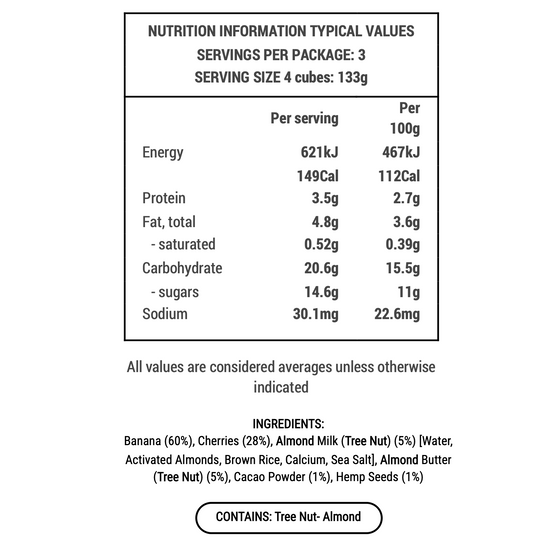 Banana (60%), Cherries (28%), Almond Milk (Tree Nut) (5%) [Water, Activated Almonds, Brown Rice, Calcium, Sea Salt], Almond Butter (Tree Nut) (5%), Cacao Powder (1%), Hemp Seeds (1%)