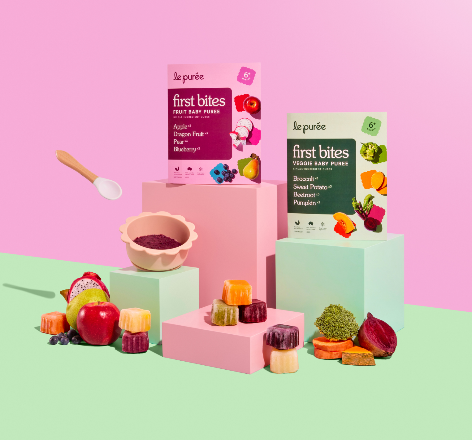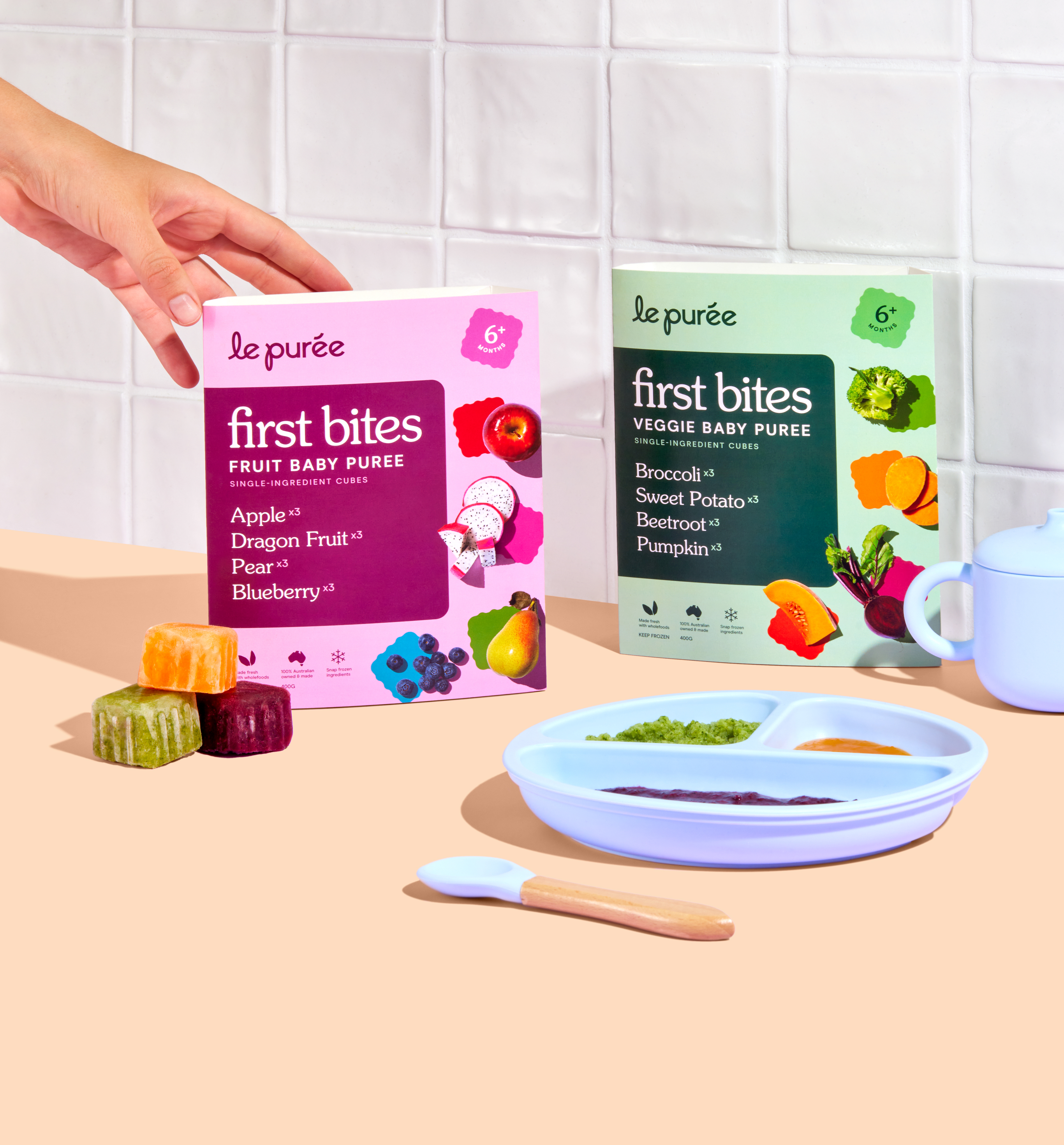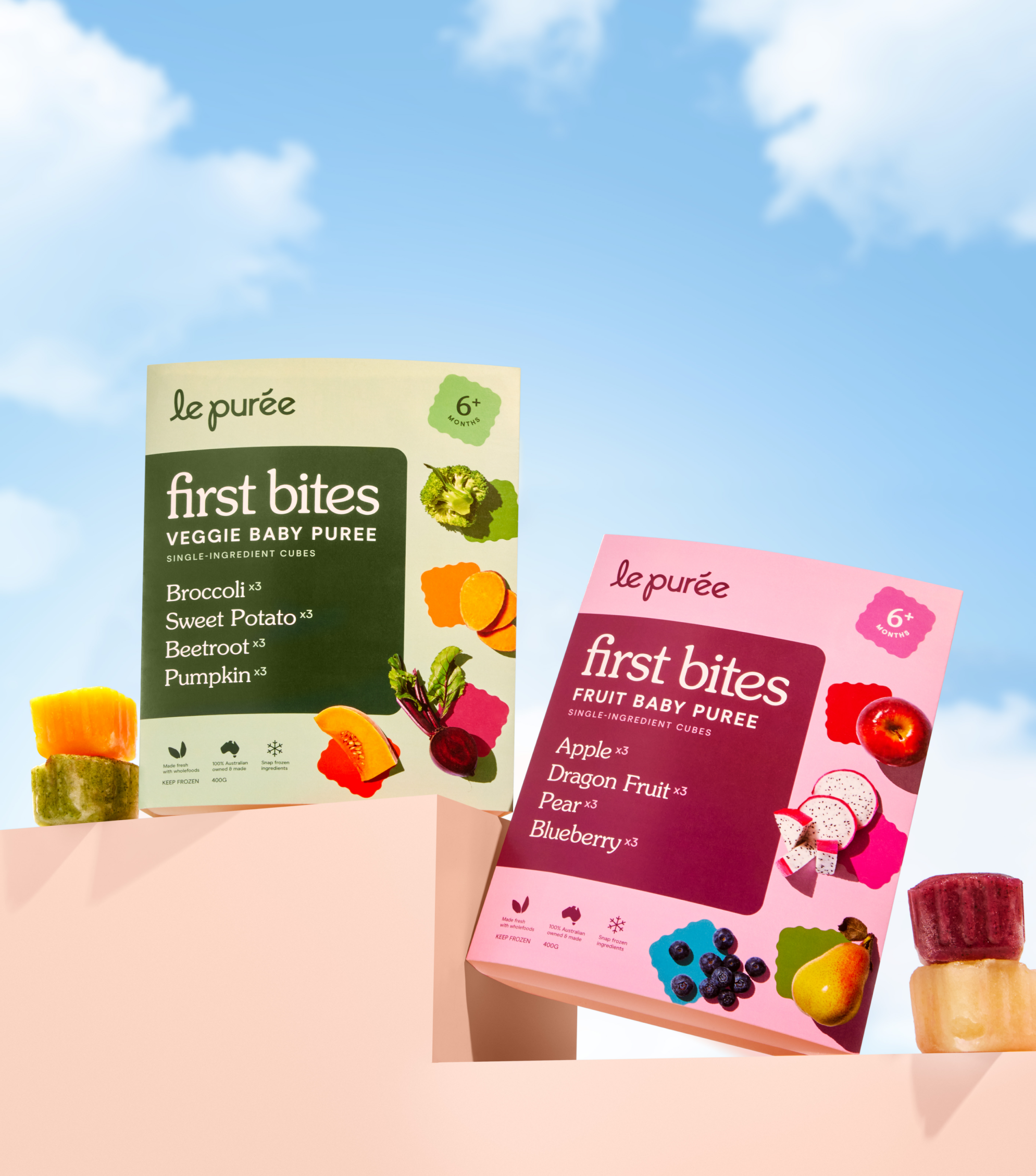 First Bites Veggie: Sweet Potato (100g - 3 cubes), Broccoli (100g - 3 cubes), Pumpkin (100g - 3 cubes), Beetroot (100g - 3 cubes) First Bites Fruit: Apples (100g - 3 cubes), Dragon Fruit (100g - 3 cubes), Pear (100g - 3 cubes), Blueberry (100g - 3 cubes)