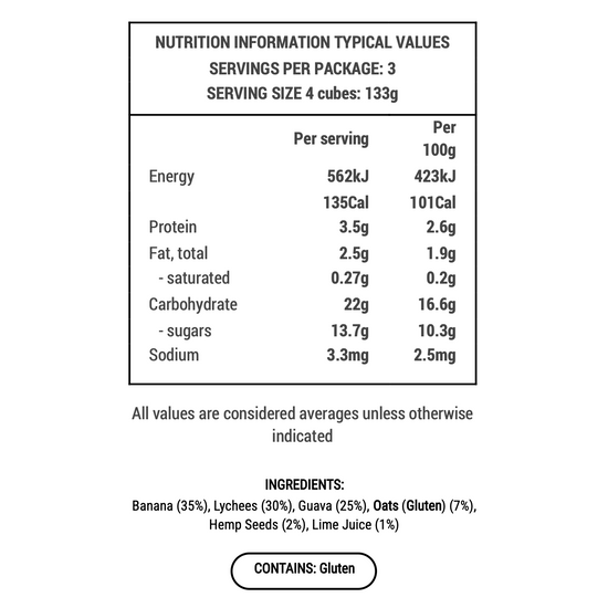 Banana (35%), Lychees (30%), Guava (25%), Oats (Gluten) (7%), Hemp Seeds (2%), Lime Juice (1%)