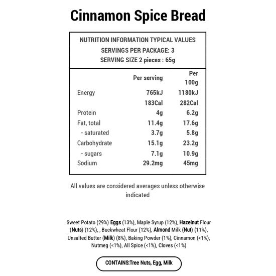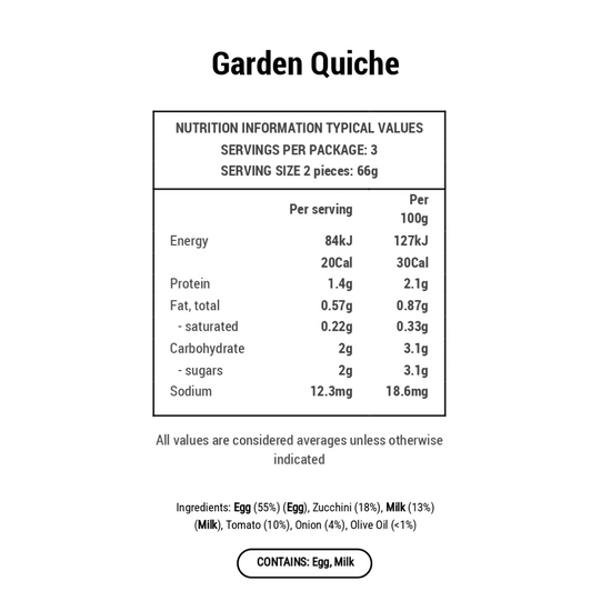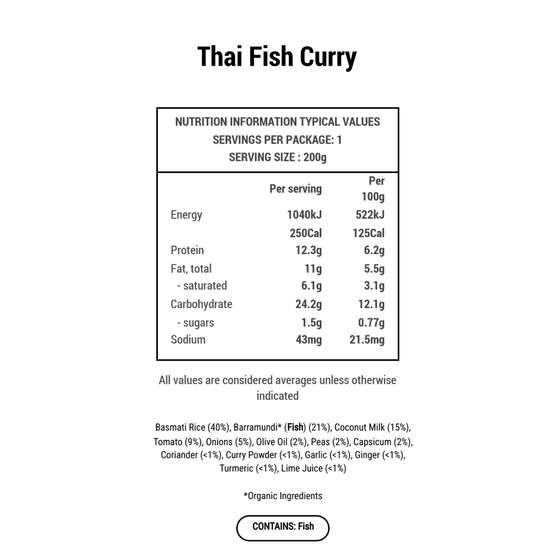 (Strawberry Chia Porridge): Mixed Berries (35%), Oats (Gluten) (23%), Banana (8%), Coconut Milk (15%), Water (15%), Lemon Juice (<1%), Chia Seeds* (<1%), Cinnamon (<1%), Vanilla Bean (<1%) (Thai Fish Curry): Basmati Rice (40%), Barramundi* (Fish) (21%), Coconut Milk (15%), Tomato (9%), Onions (5%), Olive Oil (2%), Peas (2%), Capsicum (2%), Coriander (<1%), Curry Powder (<1%), Garlic (<1%), Ginger (<1%), Turmeric (<1%), Lime Juice (<1%) (Garden Quiche): Egg (55%), Zucchini (18%), Milk (13%), Tomato (9%), Onion (4%), Salt (<1%) (Chicken & Spinach Meatballs): Chicken* (81%), Onion (9%), Spinach (7%), Panko Breadcrumbs (Wheat, Gluten) (<1%), Salt (<1%), Garlic (<1%), Oregano (<1%) (Cinnamon Spice Bread): Sweet Potato (29%) Eggs (13%), Maple Syrup (12%), Hazelnut Flour (Nuts) (12%), Buckwheat Flour (12%), Almond Milk (Nut) (11%), Unsalted Butter (Milk) (8%), Baking Powder (1%), Salt (<1%), Cinnamon (<1%), Nutmeg (<1%), All Spice (<1%), Cloves (<1%)