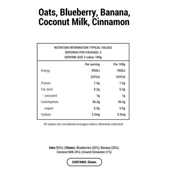 Banana Dragonfruit Chia: Banana (60%), Dragonfruit (30%), Chia seeds (5%), Coconut Cream (4%), Hemp Seeds* (1%) Oats Apple Chia Porridge: Oats (50%) ( Gluten), Apples (41%), Coconut Milk (4.5%), Chia Seeds (4%), Ground Cinnamon (0.5%) Roasted Chicken & Thyme: Pumpkin (46%), Red Lentils (33%), Chicken (15%), Bone Broth (5%), Dried Thyme (1%) Zucchini Pear Peas: Zucchini (40%), Pears (35%), Peas (24%), Mint (0.5%), Avocado Oil (0.5%) Oats Blueberry Banana: Oats (55%) (Gluten), Blueberries (20%), Banana (20%), Coconut Milk (4%), Ground Cinnamon (1%) Lamb & Zucchini: Sweet Potatoes (50%), Zucchini (20%), Carrots (18%), Lamb* (11%), Mixed Spices (1%)