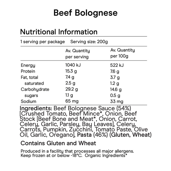 (Sardine Puree): Cannellini Beans (52%), Zucchini (37%), Sardines (Fish) (8%), Olive Oil (2%), Paprika (1%) (Lamb, Sweet Potato & Chickpea): Sweet Potato (55%), Chickpeas (24%), Lamb* (15%), Bone Broth (5%), All Spice (1%)"" (Chicken, Liver, & Fennel Puree): Pumpkin (40%), Cauliflower (30%), Carrots (15%), Chicken* (10%), Fennel (3%), Chicken Liver* (2%) (Lamb Kaftas): Lamb* (62%), Onion (31%), Parsley (4%), Olive Oil (2%), Salt (<1%), Herbs (<1%) (Beef Bolognese): Beef Bolognese Sauce (54%) [Crushed Tomato, Beef Mince*, Onion, Beef Stock [Beef Bone and Meat*, Onion, Carrot, Celery, Garlic, Parsley, Bay Leaves], Celery, Carrots, Pumpkin, Zucchini, Tomato Paste, Olive Oil, Garlic, Oregano], Pasta (46%) (Gluten, Wheat)